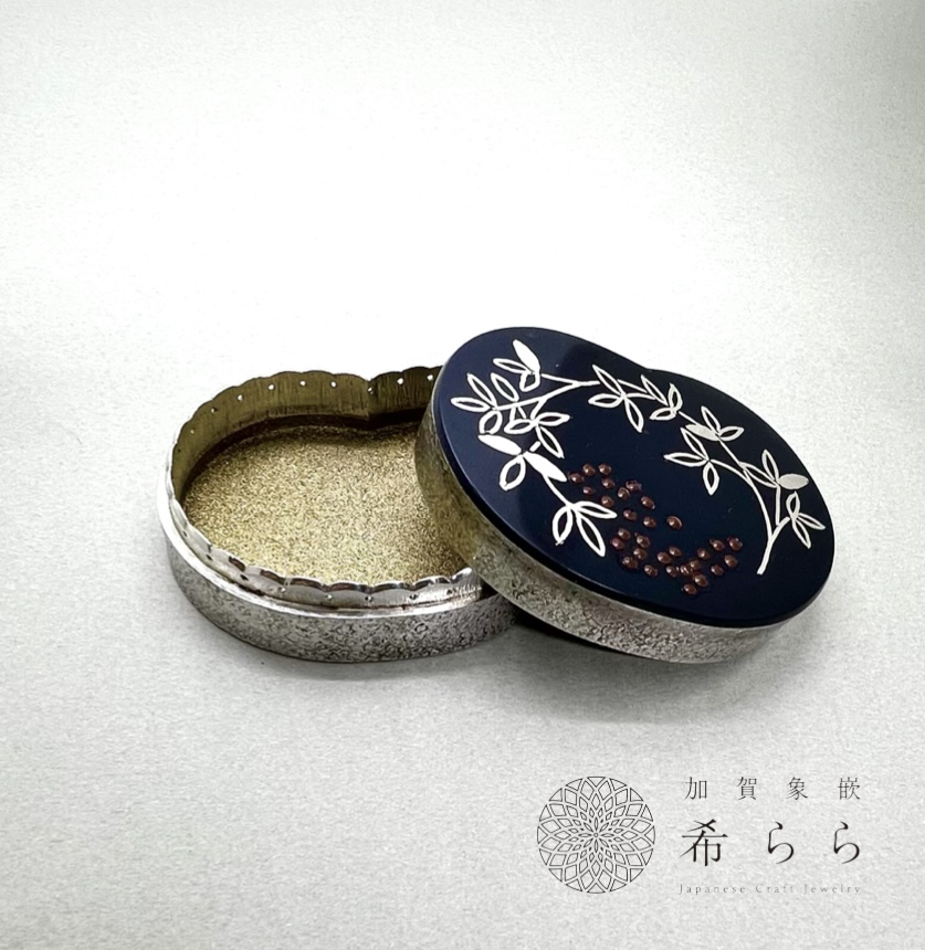 南天をモチーフに製作しました。その読み方から「難転」すなわち「難を転じて福となす」に通じ、縁起のいい木とされ、鬼門や裏鬼門に植えると良いそうで、赤銅(黒い部分)に象嵌で加飾しました。